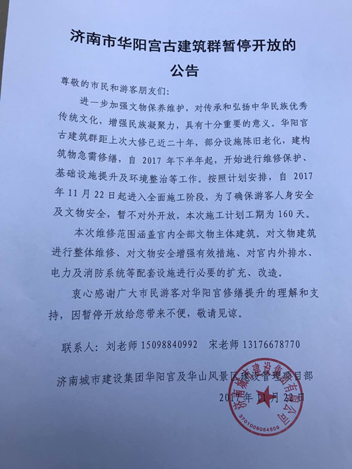 华阳宫及华山风景区建设管理项目部发布济南市华阳宫古建筑群暂停开放的公告。