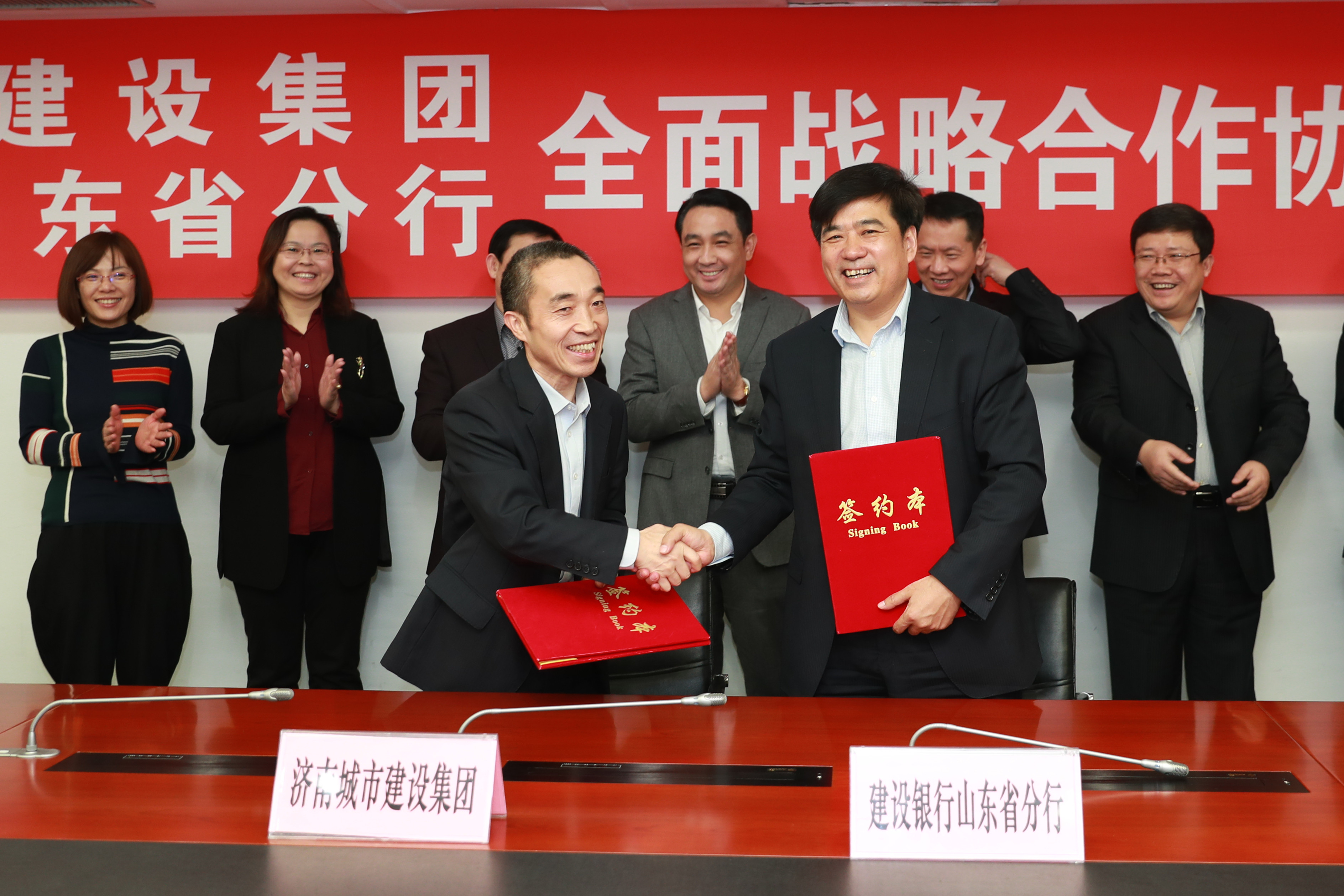 近日,集团分别与建设银行山东省分行、交通银行山东省分行签署了全面战略合作协议。集团董事长李国祥、总经理李培杰、总会计师范天云,建设银行山东省分行段红涛、朱治昌、刘春龙,交通银行山东省分行于启春、赵秀军、刘安奎等相关负责人出席了签约仪式。