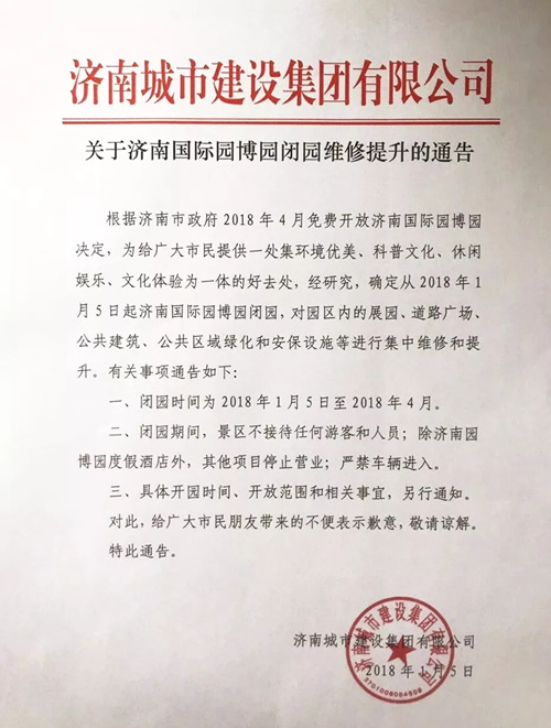 决定即日(2018年1月5日)起对济南国际园博园进行闭园维修提升改造,现发布《关于济南国际园博园闭园维修提升的通告》,全文如下: