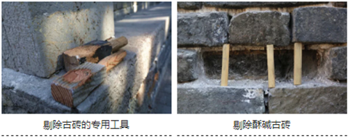 在华阳宫内的古建墙壁上,不时能发现一个个的小“伤口”,据现场工作人员介绍,这些都是剔除墙壁上已经酥碱(墙体逐层酥软脱落的一种现象)的古砖后留下的,这个剔除工作需要谨小慎微,避免剔除未酥碱的砖体,一块两巴掌大小的古砖,一个工人用特制的木器剔除,要花上整整一天的时间。
