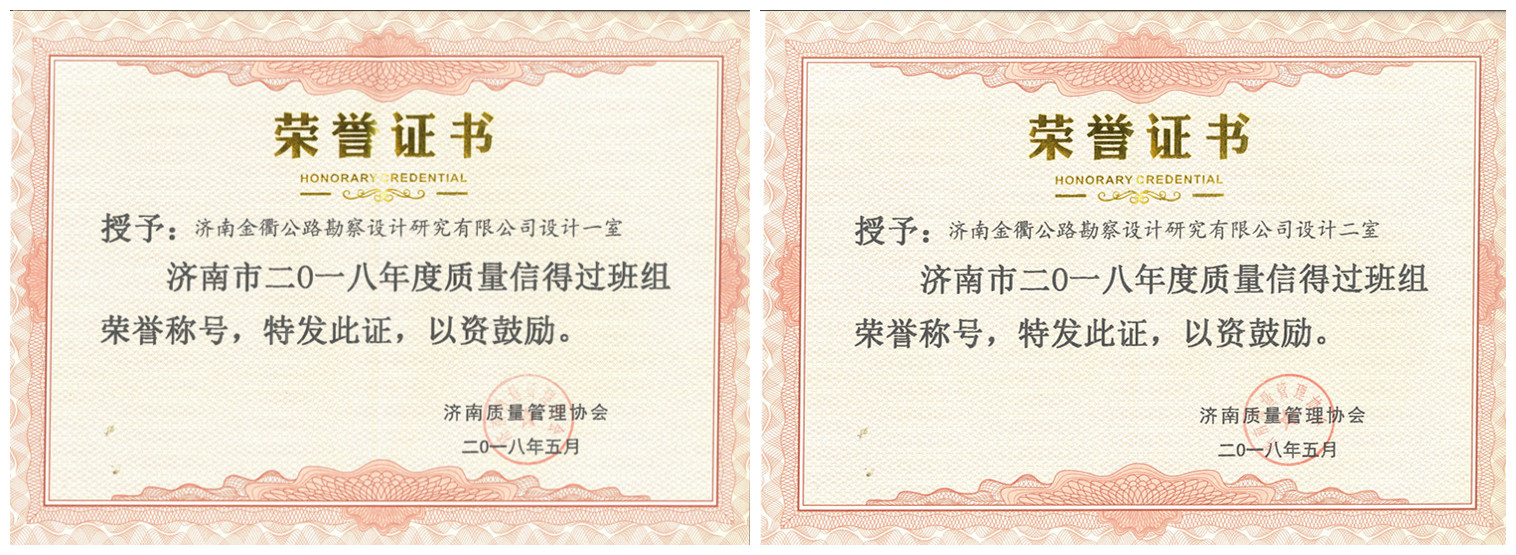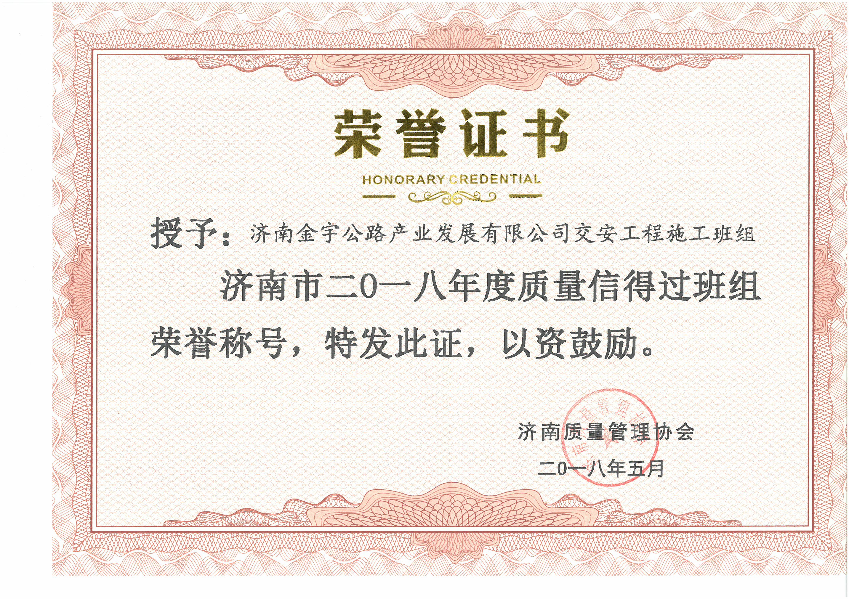 济南金宇公路产业发展有限公司交安工程施工班组荣获济南市2018年度质量信得过班组荣誉称号;公司凭借《提高防眩网安装一次验收合格率》、《提高标志版面安装平整度》两项课题荣获“济南市2018年度质量管理成果一等奖”;《提高公路声屏障线性顺直度合格率》课题荣获“济南市2018年度质量管理成果二等奖”;《降低热熔标线逆反射系数衰减率》课题荣获“济南市2018年度质量管理成果三等奖”;授予李玉宝、李景军、刘莉三名同志2018年济南市优秀质量管理工作者称号。