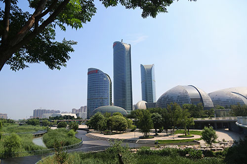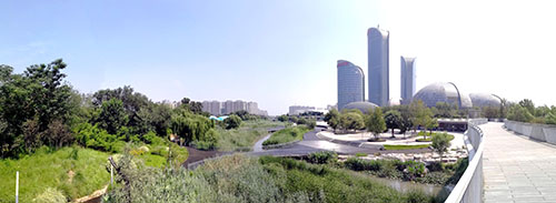 腊山河是济南西部的一处重要河流,同时也是西客站片区内的一条生态景观带,景观带在2013年十艺节期间建成,与“一院三馆”相映成趣。