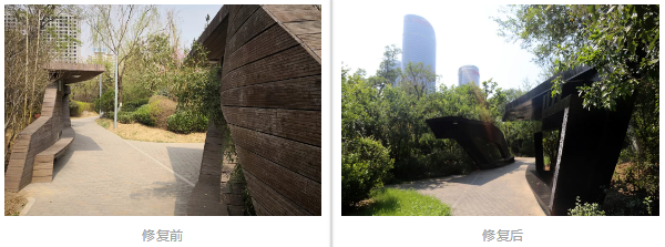 本次工程主要包括高速广场及三馆广场重竹地板维修、木栈道路修复、局部河道清淤三项主要内容,其余还有修补渗水方砖地面、广场金属栏杆刷漆、广场区域休息座凳整修、广场区域木质墙面固定刷漆、跨河石桥栏板地面局部饰面板缺失等零星工程,均为在原貌基础上进行修复。工程完工后,集团下一步将委托专门的维护单位对腊山河进行常规维护,让腊山河水常清、岸常绿。