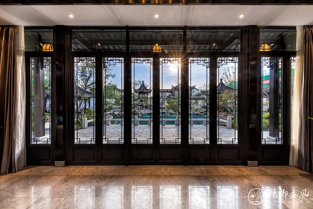 另一套大户型样板房采用新中式风格,以儒家思想为依托,通过大理石、金属铜、木材的有机结合,体现主人的稳重、尊贵和优雅。约110㎡的大面积庭院,演绎着四季不落幕的锦绣风光;挑高约5.7米的地下空间,让格调生活随心定制。整套样板房抒写着文雅灵动的东方气韵,展现了“中正和雅”的国风意境。