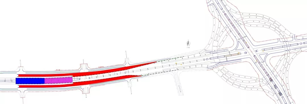 首先在立交桥两侧新建两条上下桥匝道(图中红色部分),满足施工期间车辆正常通行。第二步再进行现状引桥拆除(图中蓝色部分),最后进行顶升施工(图中玫红色部分)。