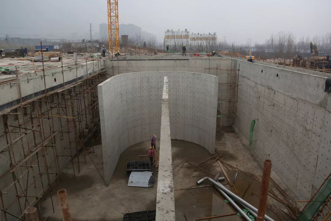 高效沉淀池及转盘滤池是项目建设最为复杂的通水单体,包含东侧二沉池、西侧二沉池及高效沉淀池。沉淀池内污水能有效沉淀水中的泥沙以及污泥等污染物,其中高效沉淀池采用多级沉淀以及离心作用,从而提高了沉淀以及分离效率,提高了污水处理的效率以及污水处理质量。截至目前,东侧二沉池的主体结构已全部完成;西侧二沉池已完成结构施工,正在进行剩余结构混凝土浇筑工作;高效沉淀池正进行模板加固工作,现场按12月15日主体结构完成节点推进施工。