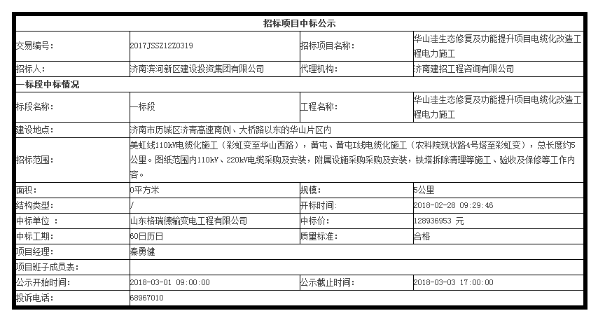 华山洼生态修复及功能提升项目电缆化改造工程中标公示