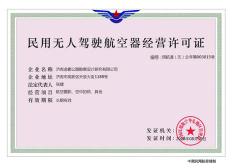 根据民航部门颁布的《民用无人驾驶航空器经营性飞行活动管理办法》及《无人机驾驶航空器飞行管理暂行条例》规定,济南金衢公路勘察设计研究有限公司即刻选派人员参加无人机驾驶员培训,于2018年8月16日获得“中国民用航空华东地区管理局颁发的《民用无人驾驶航空器经营许可证》”,公司员工李波同志获得民用无人机驾驶员合格证和无人机超视距驾驶员合格证。