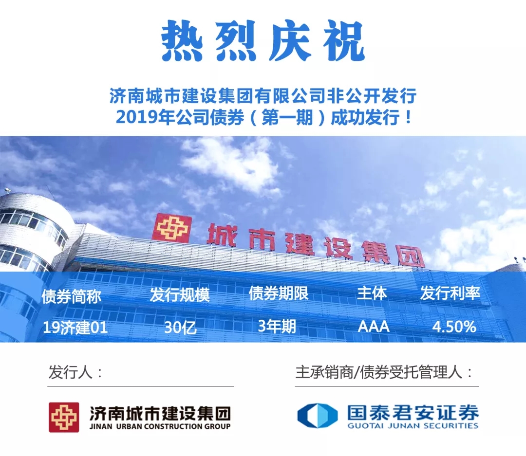 4月12日,济南城市成人看片 非公开发行2019年公司债券(第一期)成功发行。济南城市成人看片 公开市场首期债券在当天完成簿记,并发布3月社会融资规模、进出口数据超预期回暖的不利市场情绪中,成功发行30亿元,债券期限为3年期,发行利率为4.5%(低于3年期贷款基准利率4.75%)。
