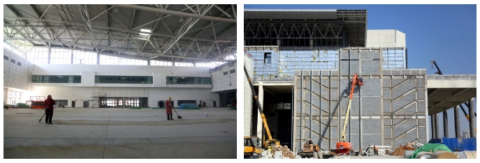 遥看会展中心,5个展馆高低错落、依次排开,颇为壮观,外形似泉水流动起伏,建筑的阳刚之美与泉水灵动之姿完美融合。进入展馆内部,4号馆、5号馆内部建设已基本完成,目前展厅基本具备布展条件,4号馆、5号馆均为一层展馆,地面承载5吨/平方米,净高度12~19米;1号馆、2号馆、3号馆目前正在进行外墙保温及涂料施工,计划本月底整体完工,5月底竣工,届时将满足大型机械展等各类展会需求。