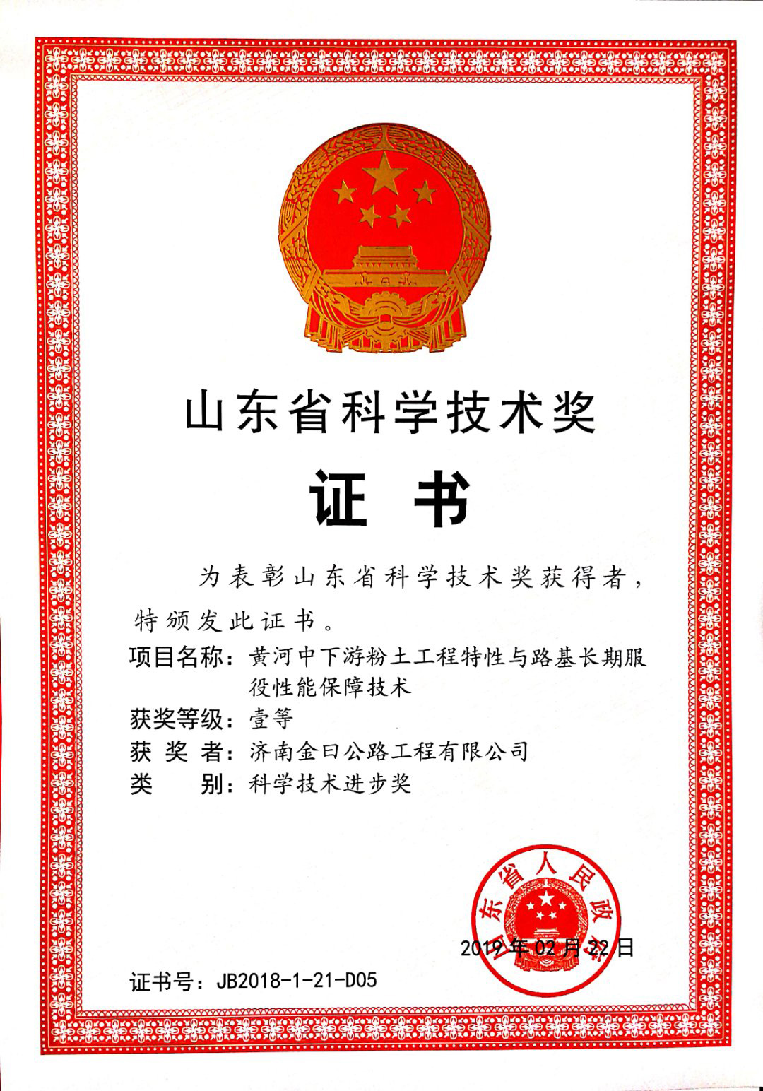 所属济南金曰公路工程有限公司参与研发的《黄河中下游粉土工程特性与路基长期服役性能保障技术》科研成果,荣获2018年山东省科技进步一等奖。