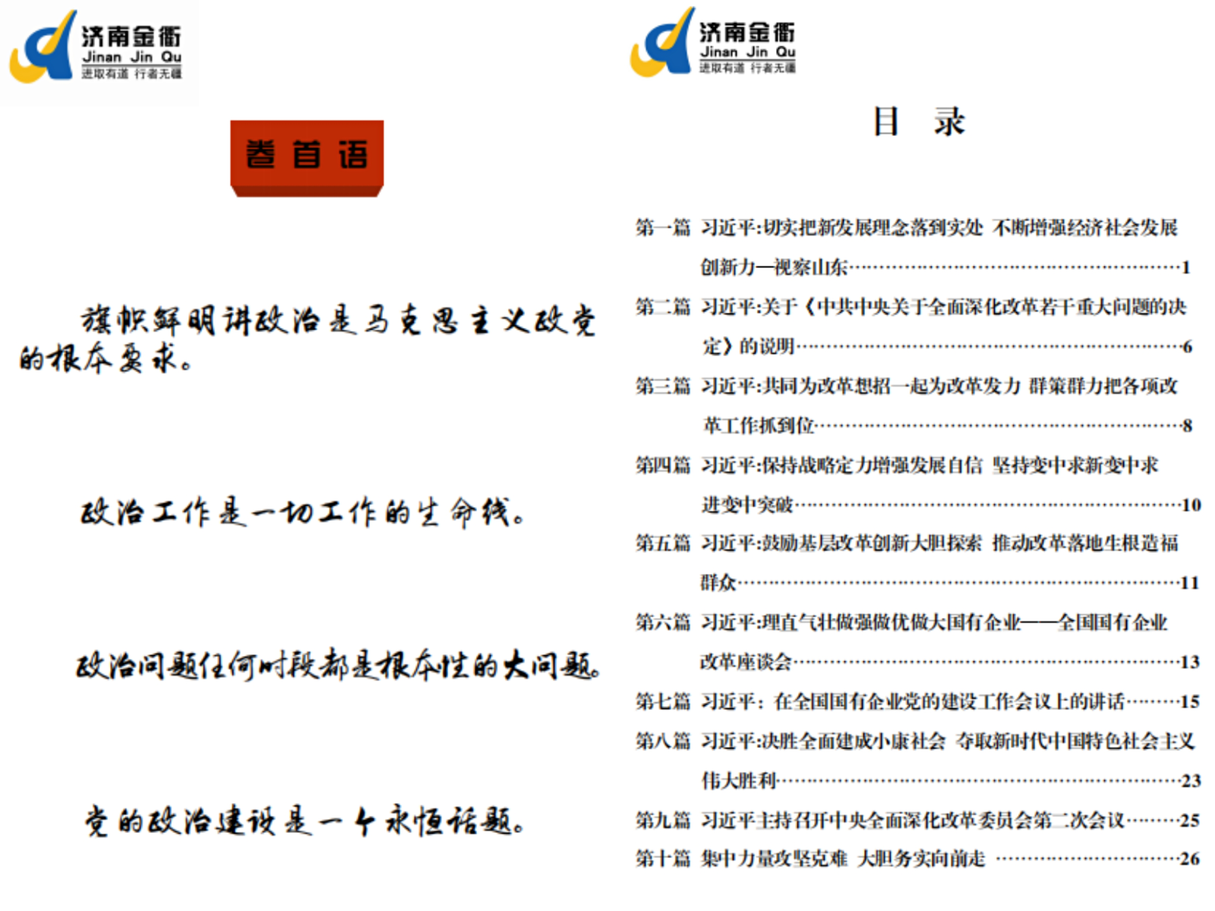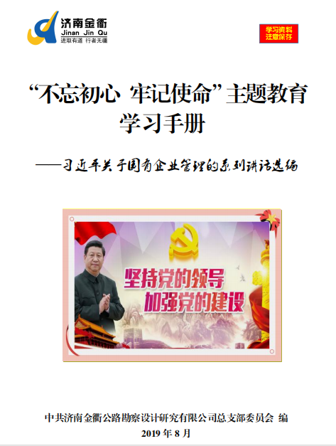 为扎实推进“不忘初心、牢记使命”主题教育深入开展,不断总结提炼工作成果,切实抓好主题教育与本领域工作的深度融合,更好的促进党员干部学习的自觉性和主动性,8月份,济南金衢公路勘察设计研究有限公司编印了以“习近平总书记视察山东重要讲话指示精神”、“关于国有企业改革管理系列讲话”为主要内容的学习手册,作为公司主题教育学习辅导读本,进一步丰富了学习载体。