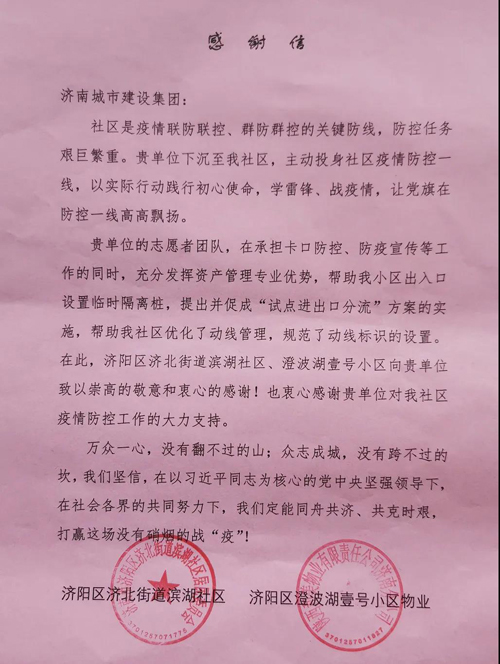 4月20日下午,在集团第十一批下沉社区疫情防控服务队即将完成执勤任务之时,济阳、济北街道社区将四面锦旗和一封饱含深情的感谢信送到志愿者手中,表达对济阳、济北小组志愿者的感谢与认可。