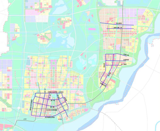 大桥组团:引爆区北边界路(大桥段)、横一路、横二路、G220G308贯通路、科学城南边界路、安置西区西边界路、S101、纵一路、纵二路、G104、纵三路、纵四路;