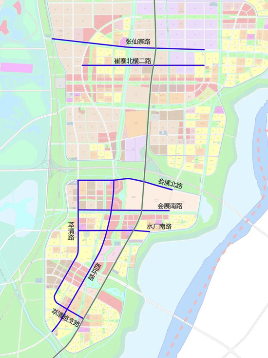 崔寨组团:萃清路支路、水厂南路、会展南路、会展北路、崔寨北横二路、张仙寨路、萃清路、西环路。