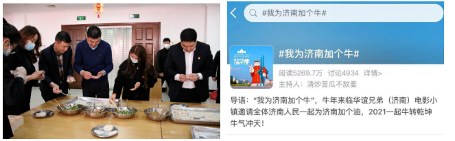 2021春节期间,华谊兄弟(济南)电影城投资开发有限公司开展了年终总结表彰会、包饺子迎新年、我为济南加个牛等一系列新春活动,喜迎牛年新春佳节的到来,营造了喜庆祥和的节日氛围。