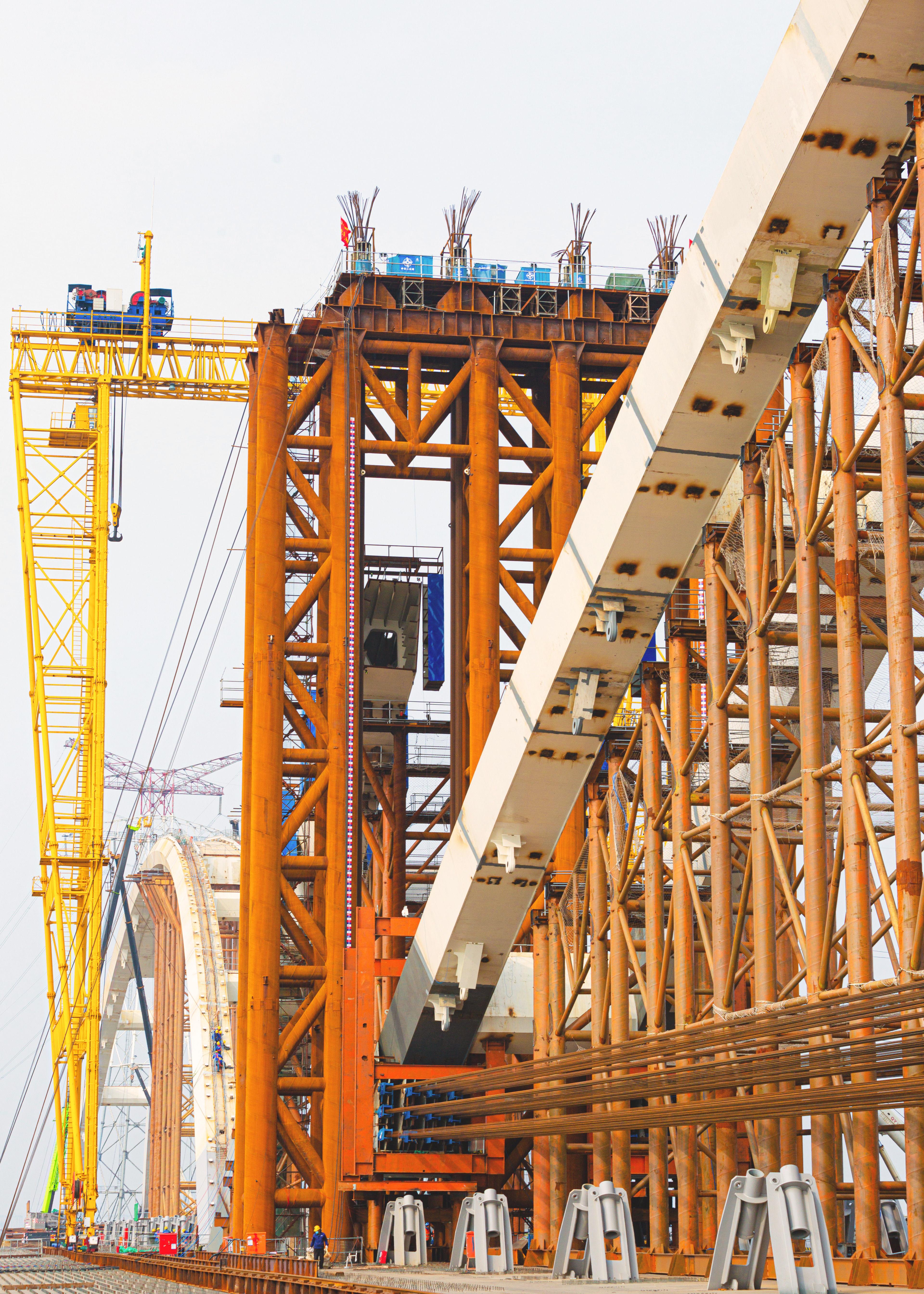 齐鲁黄河大桥主跨420米拱肋提升是整个主桥施工难度最高、风险最大的关键节点,其提升跨度为300米,提升重量达6800吨。在拱肋架设过程中,项目克服了超重构件吊装、拱肋节段安装精度控制等重大难题,自主研发了120吨大规模龙门吊进行超高拱肋节段架设作业,并且项目引入了龙门吊运行状态在线监测系统,实时监测门吊运行状态,确保施工安全;研发设计的自动化姿态调整吊具+三向千斤顶精调系统,实现拱肋节段位置毫米级误差安装。