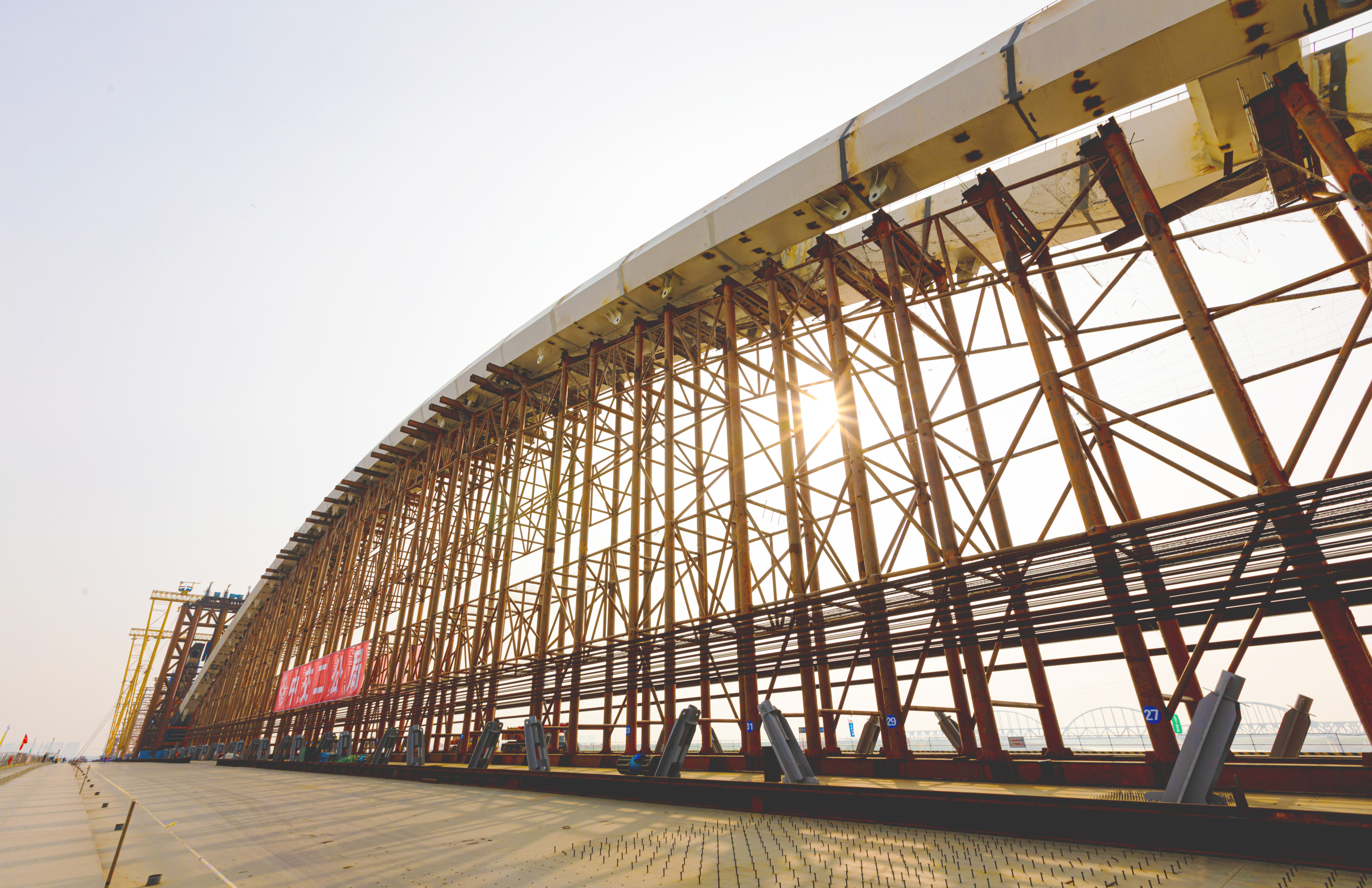 齐鲁黄河大桥位于济南市槐荫区,是济南市推进新旧动能转换和携河北跨发展的关键性工程,按照双向八车道一级公路标准设计,公轨同层,兼顾城市主干路功能,设计速度60公里/小时,线路全长6742米,主桥长度1170m。齐鲁黄河大桥为黄河之上首座下承式网状系杆拱桥,主跨径达420米、宽60.7m,创世界同类型桥梁最大跨径、最大梁宽,其400Mpa超高应力幅拉索在桥梁建设领域首次研发应用。