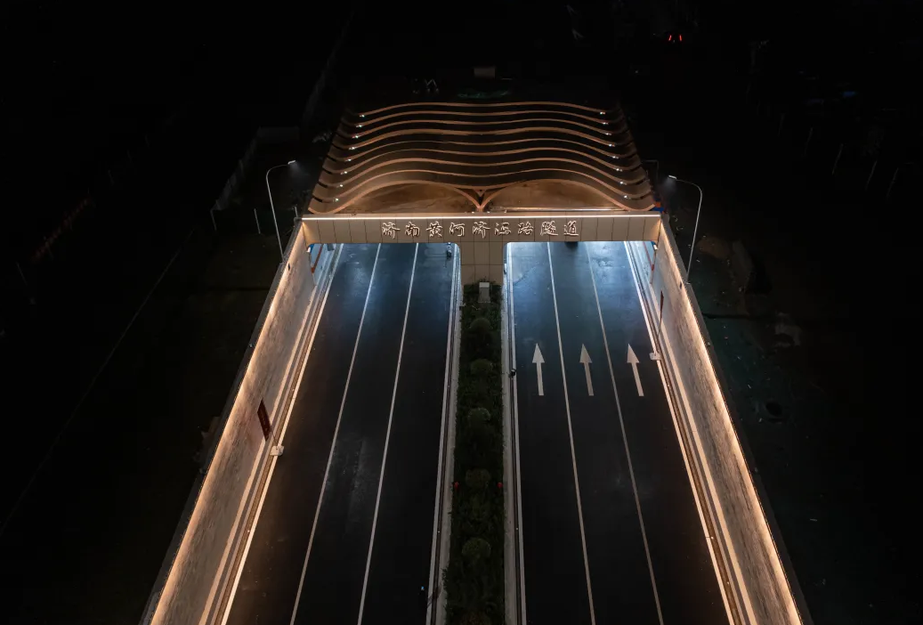 济南黄河济泺路隧道设计方案以黄河文化根脉为基,黄河之“光”为“场”,融合黄河历史、文化、自然、艺术等表现黄河两岸是我家。“黄河根脉岁岁安澜”主题设计定位为城河相融,动静相融,蕴含“天人合一”的设计理念,让黄河隧道艺术空间景观和自然互为补充。设计中借黄河水纹传统纹样,将黄河文化与自然生态中的场地、色彩、光影结合,再造了黄河地形与黄河流动的自然之美,描绘了新时代黄河画卷中诗情画意的城市底蕴。