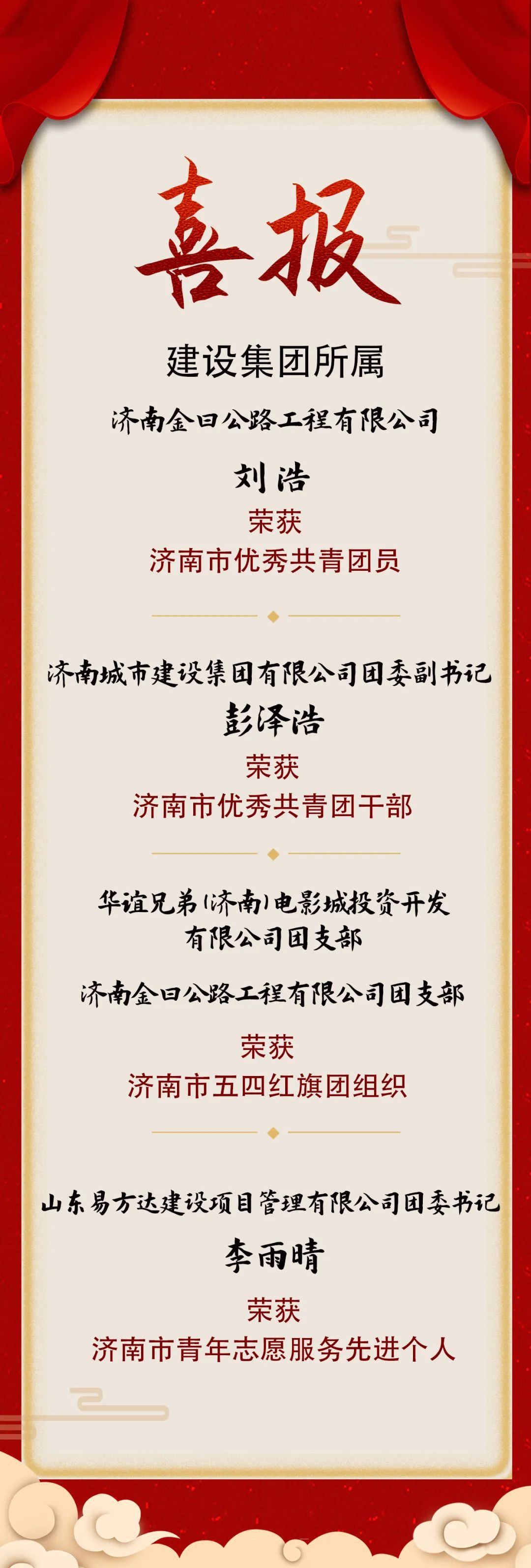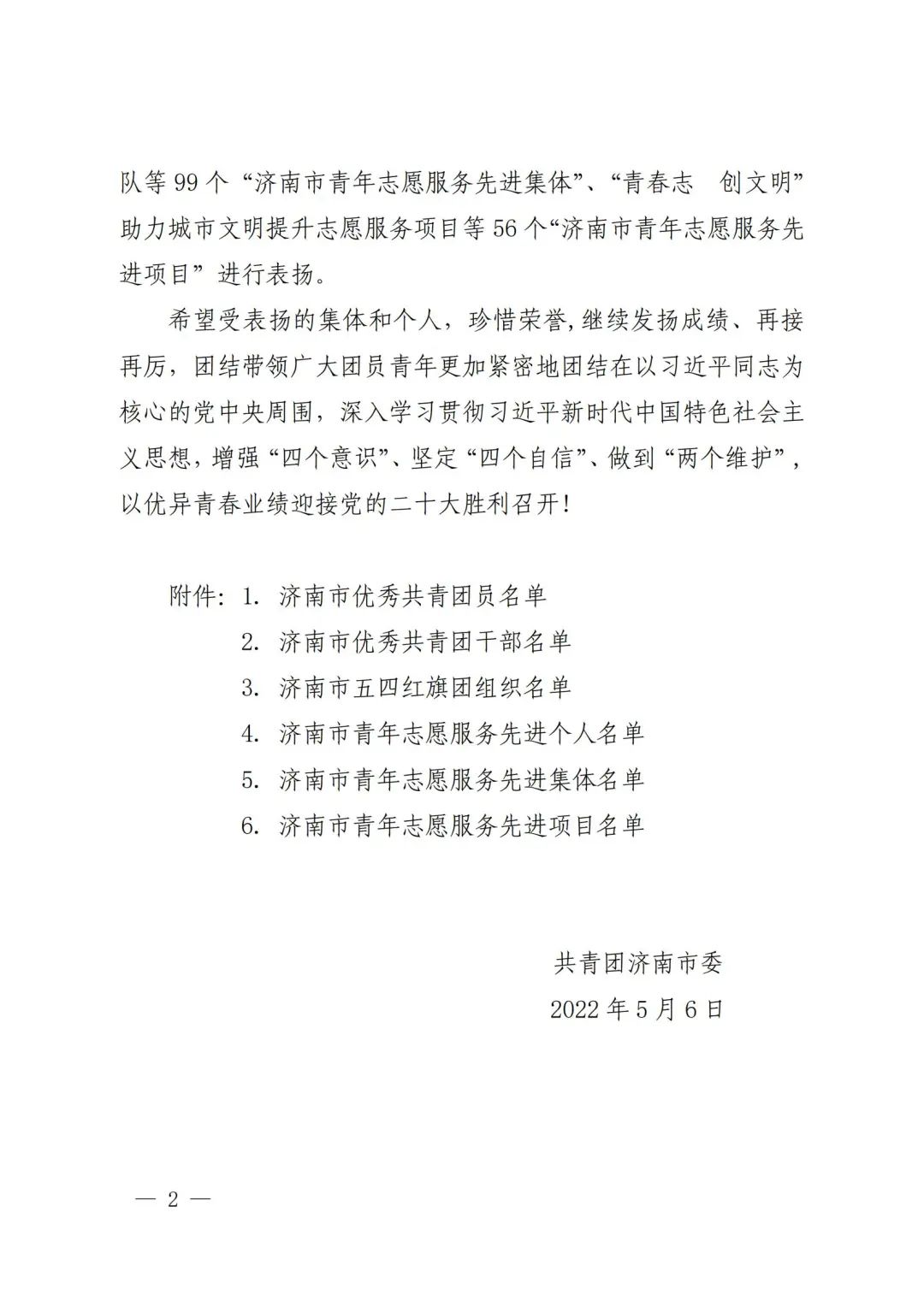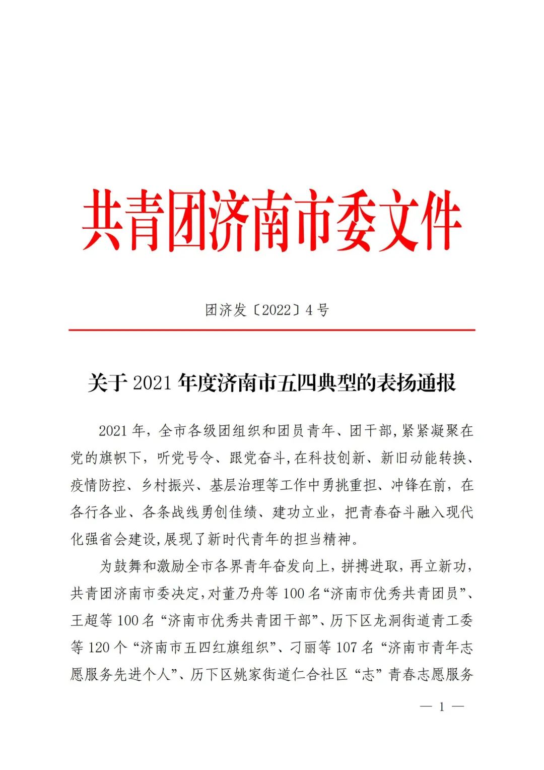 近日,共青团济南市委公布了《关于2021年度济南市五四出彩典型的表扬通报》,成人看片 团委所属团组织及团员青年荣获“济南市五四红旗团组织”“济南市青年志愿服务先进个人”“济南市优秀共青团员”“济南市优秀共青团干部”等4项荣誉称号。