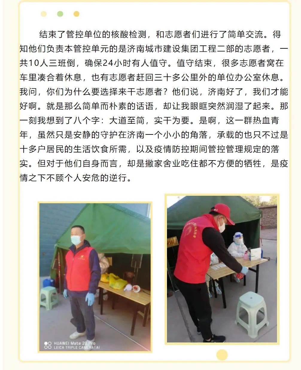 “他们说,济南好了,我们才能好啊。简单而朴素的话语,却让我眼眶突然润湿了起来,那一刻我想到了八个字:大道至简,实干为要。”近日,历城区董家街道办的工作人员在“爱董家”微信平台上写下了这样的话,他口中的“他们”便是按照集团统一部署下沉到董家街道社区的工程二部志愿者们。