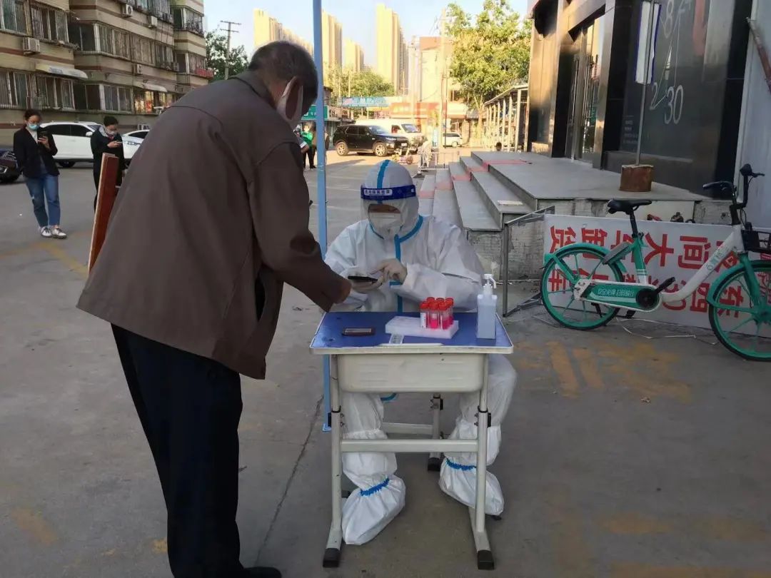 他们下沉的联四社区居民约8000余人,同样是老年人居多,手机扫码操作相对困难,为提高核酸检测效率,城建集团李楠用自己的手机帮助耐心细致地帮老年人进行信息录入。