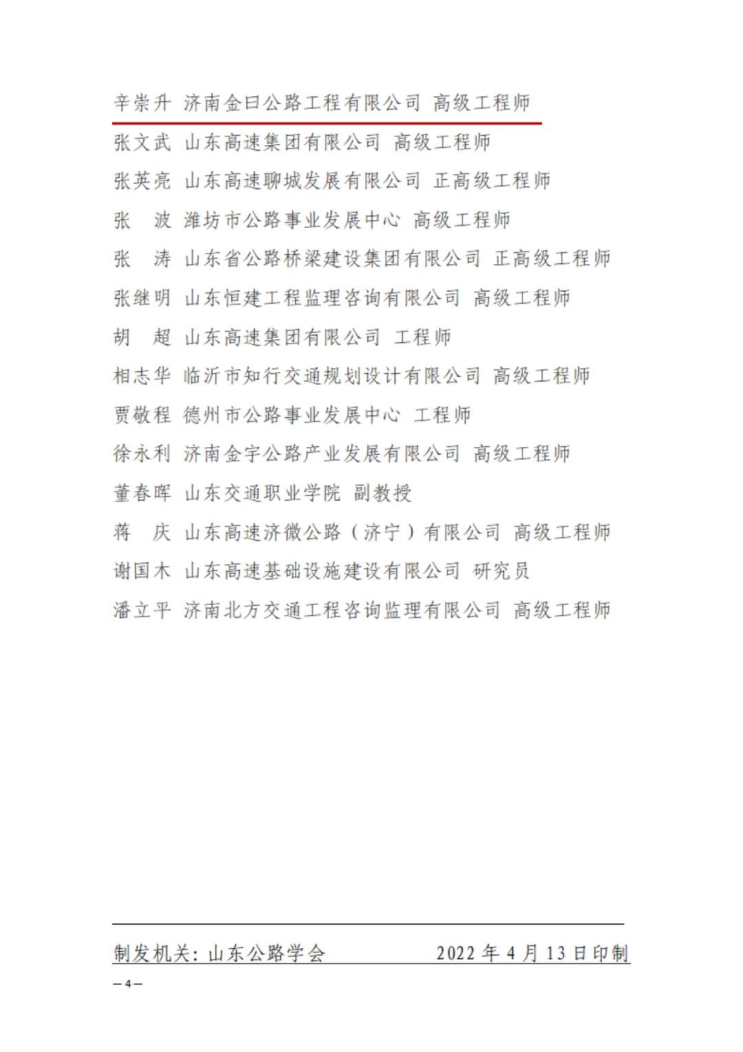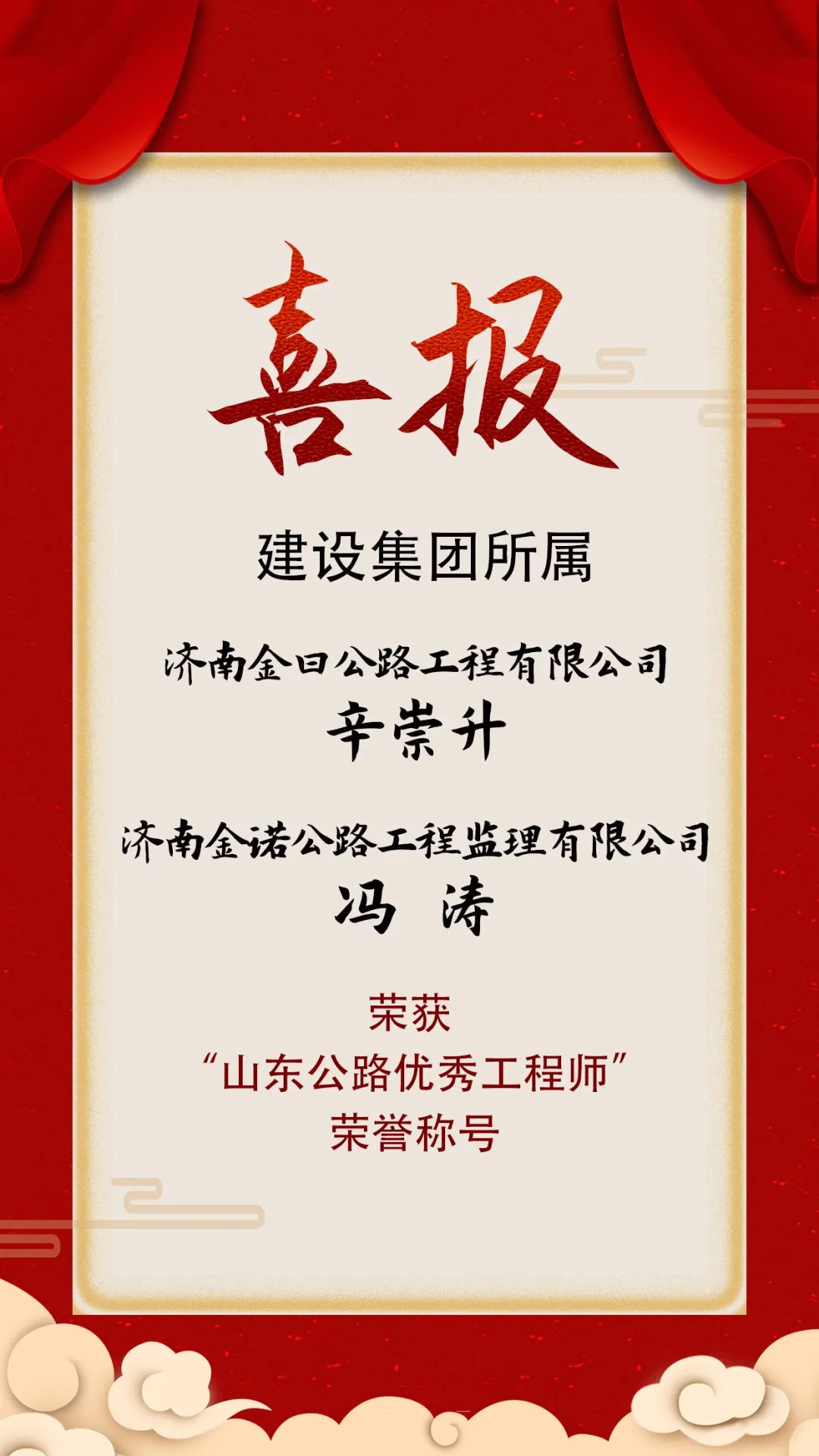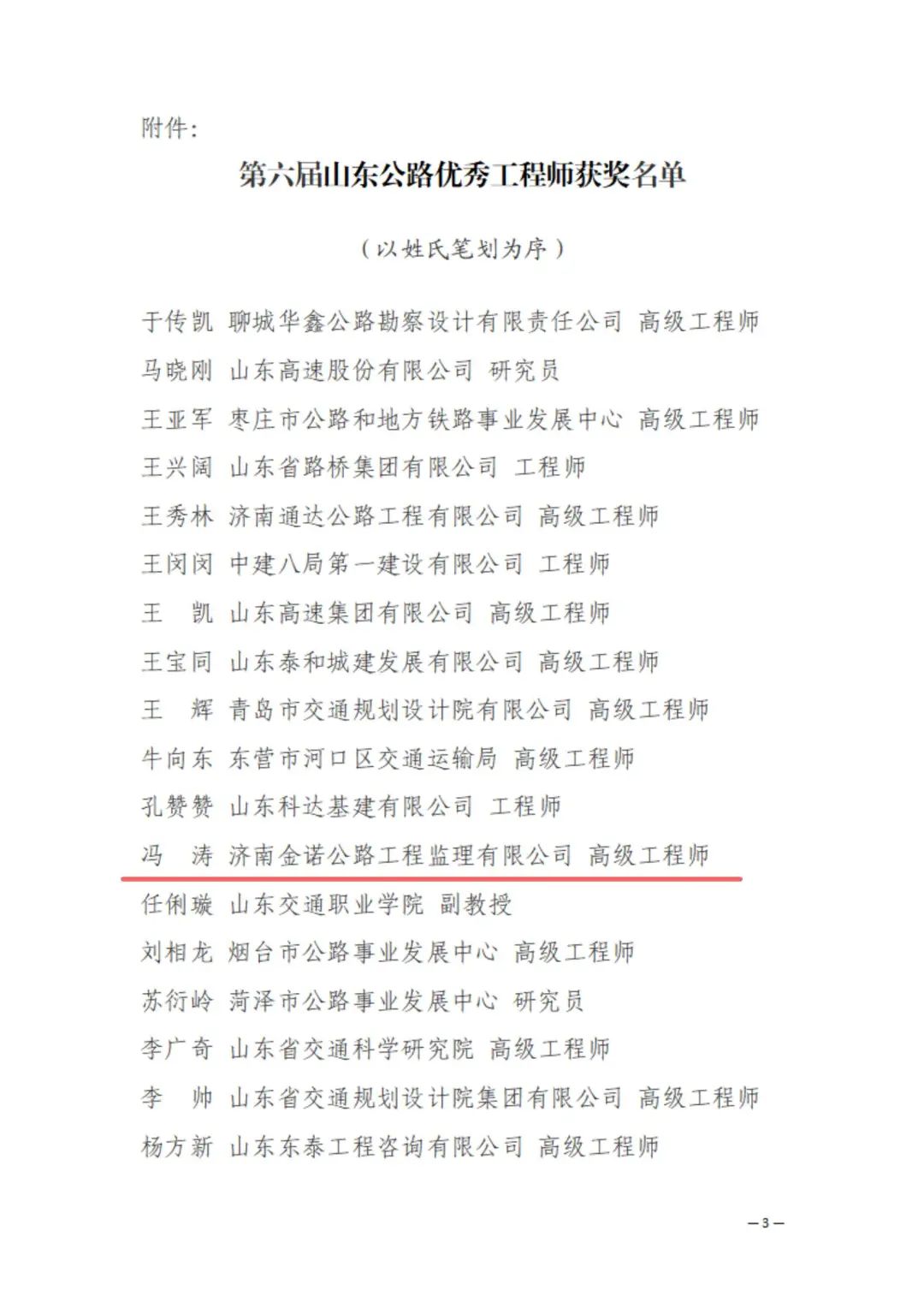 所属济南金曰公路工程有限公司副总经理辛崇升、济南金诺公路工程监理有限公司副总经理冯涛荣获 “山东公路优秀工程师”荣誉称号。