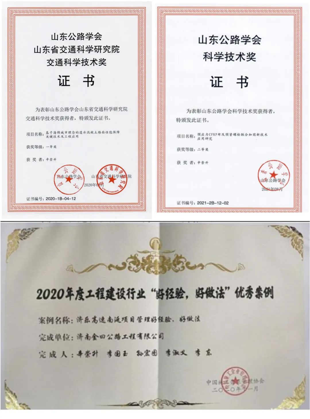 近年来,辛崇升同志先后取得了一级建造师(公路、市政)、试验工程师(公路、材料、桥梁、隧道)、注册安全工程师等执业证书。经过多年的施工技术管理积累,先后将国内外先进技术(桥梁顶升、数控智能张拉、钢管混凝土施工等)应用于建设中,并撰写了国家及省级工法,申报专利8项,撰写论文5篇,获得山东公路学会科学技术奖2项。