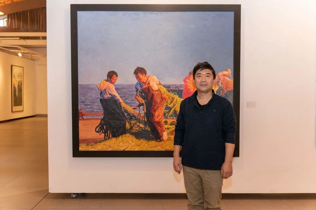 像李兆虬一样,济南市职工文化事业发展中心副研究员吴爱民的作品也是聚焦一线劳动者。作品《海上奏鸣曲》创作背景源自吴爱民到石岛采风时,清晨在码头看到的渔民出海归来时的丰收景象。