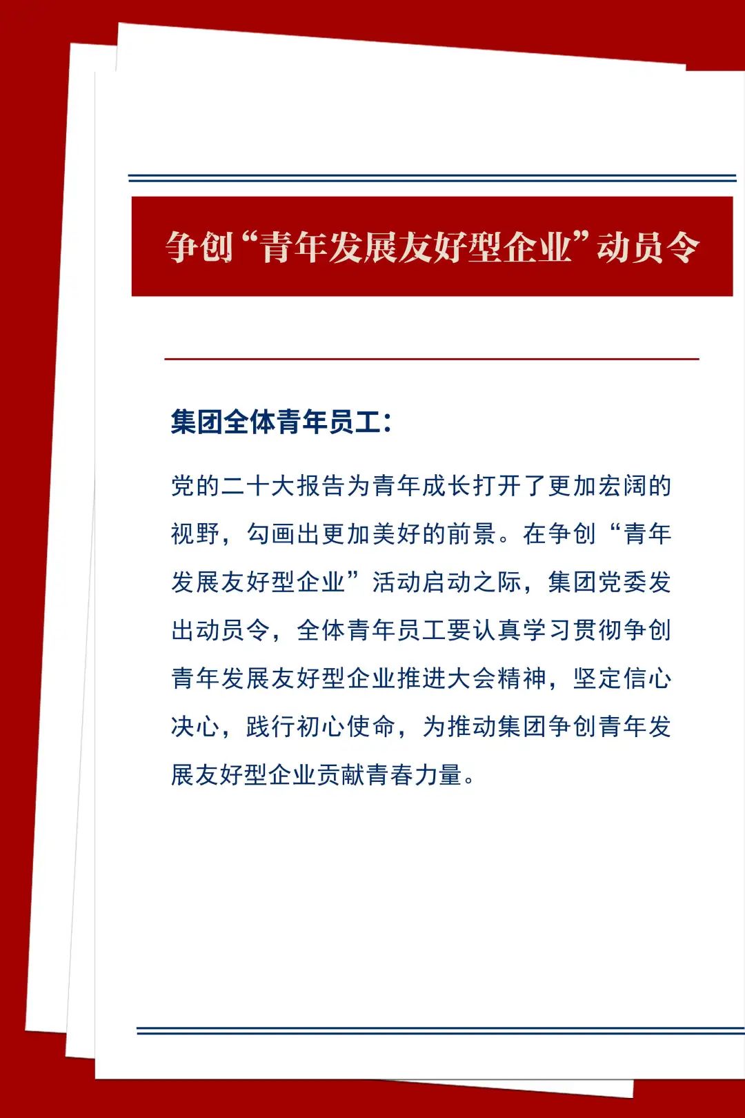 全体青年员工要以对党和集团高度负责的精神对待本职工作,主动深入一线,切实发挥青年人朝气蓬勃的精神和干劲。进一步强化党建、团建引领和政治保障,提高政治站位、强化使命担当,带头响应集团争创青年发展友好型企业号召,主动宣传、引导、以实际行动带动身边人参与到活动中来。