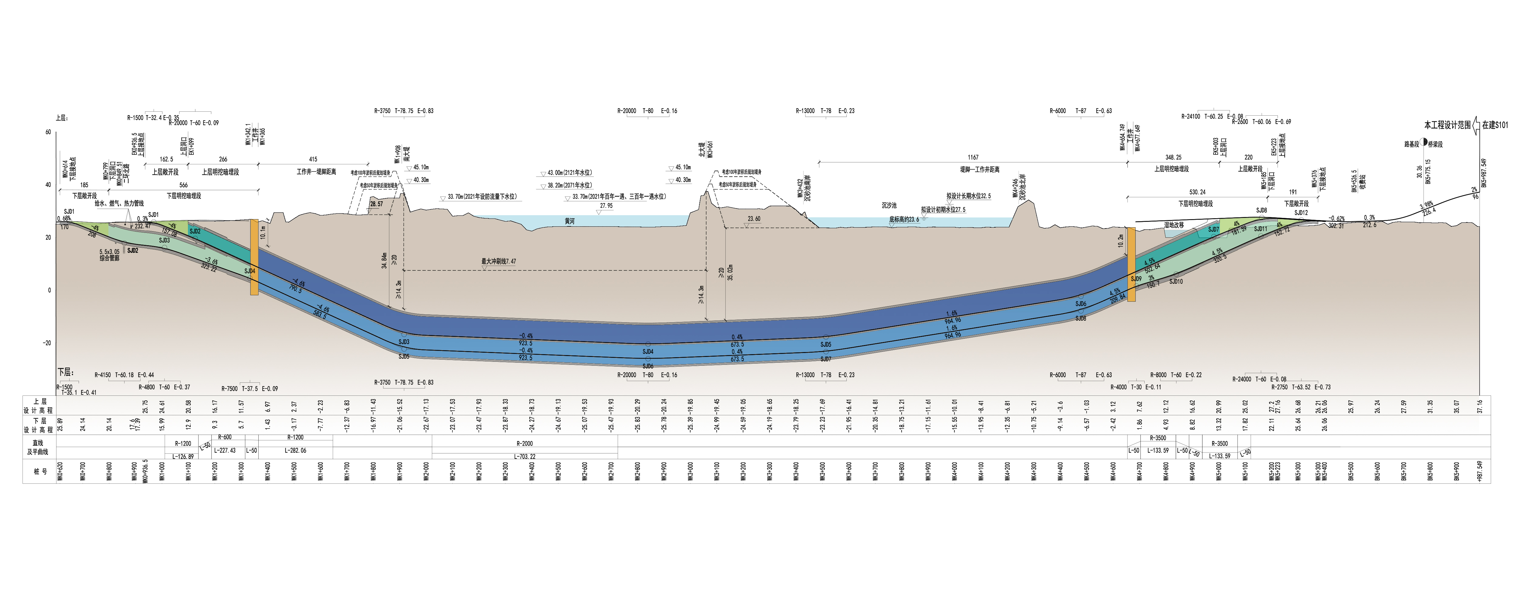 负责投资建设,工程南起蓝翔中路,向北穿越济广高速、黄河、鹊山水库沉沙池,在龙湖湿地公园接地,设置收费广场,与在建G309立交衔接。工程总长约5.8km,其中隧道段长约4.8km,盾构段长度3.3km。隧道采用单洞双层,通过一条盾构隧道,解决两个方向的车辆通行问题,布置双向6车道,上层通行南向北交通,下层北向南,设计车速60km/h。盾构隧道外径16.8m,是下穿万里黄河最大直径盾构隧道。