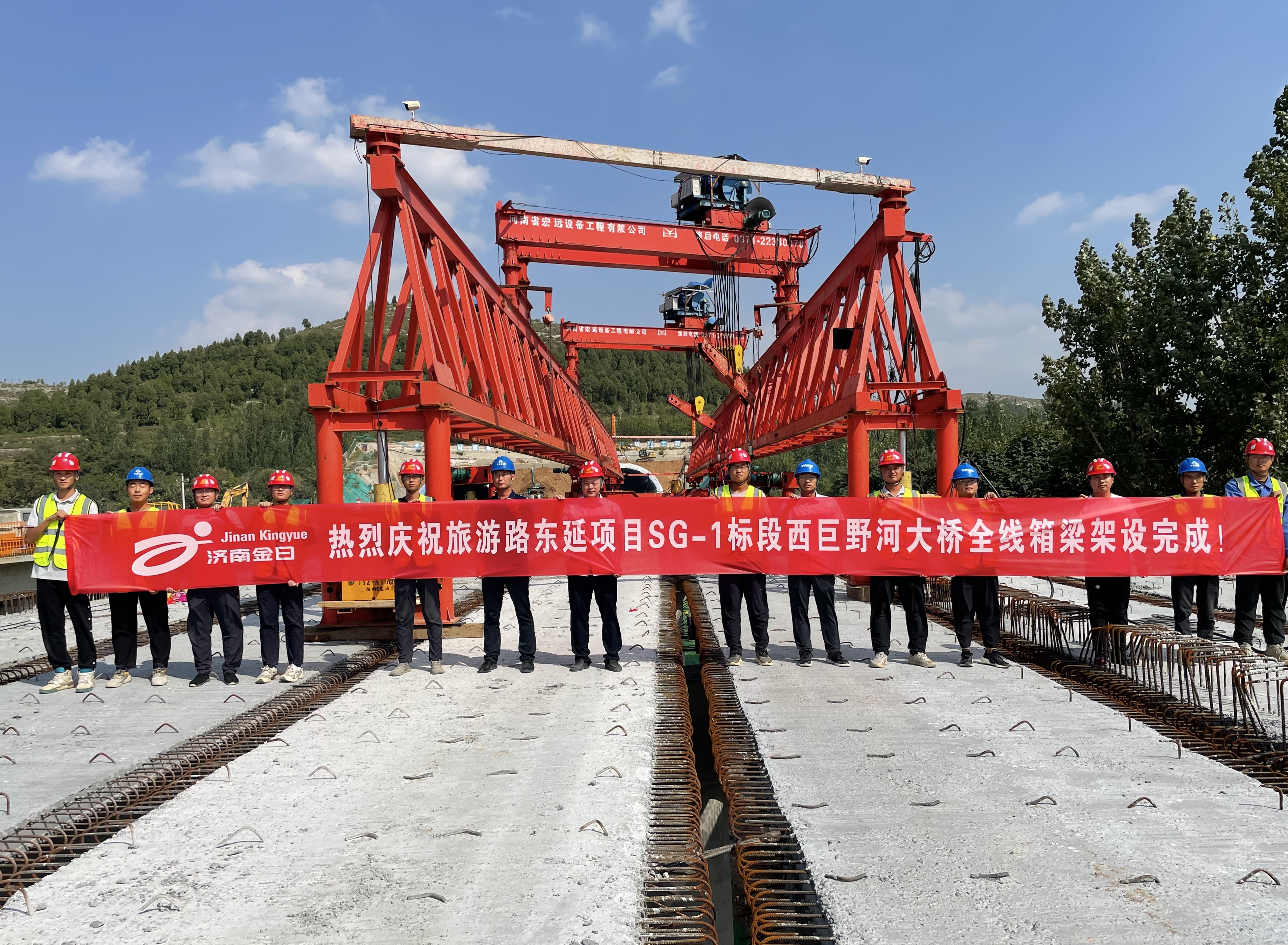 所属济南金曰公路工程有限公司承建的旅游路东延项目西巨野河大桥梁板架梁施工圆满完成。