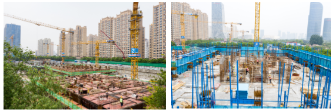 目前,1#楼至14#号楼正进行主体结构施工,地下室准备进行基础验收;车库7#8#楼中间车库混凝土浇筑、7#楼北侧车库支模架施工、12#14#楼中间车库顶板铺设。
