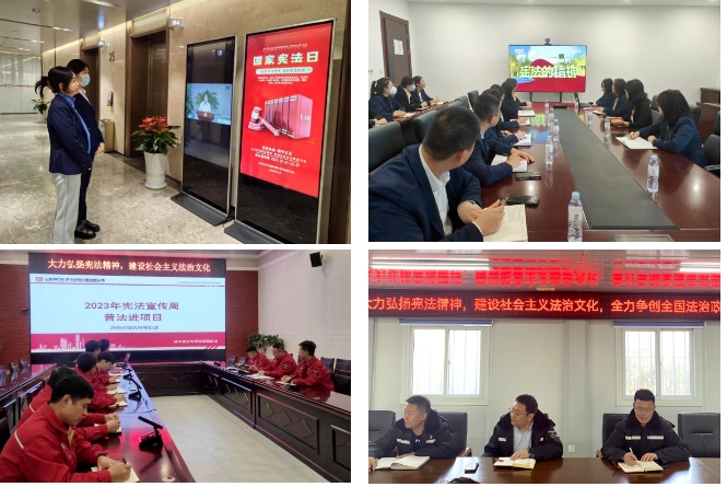 活动期间,集团在宣传平台开设“法治小课堂”栏目,推送《国家宪法日| 宪法和你的一生有什么关系?》《宪法宣传周│“宪法知识知多少”专题测试》《宪法宣传周│习近平法治思想应知应会(上)》《宪法宣传周│习近平法治思想应知应会(下)》《宪法宣传周│习近平法治思想专题测试》5篇普法推文,并通过集团电子屏投放宪法宣传海报,营造浓厚活动氛围。同时,集团积极组织各部室、子公司积极参与2023年全国 “宪法宣传周”宪法知识网上竞答活动,广泛动员各子公司灵活采用线上、线下相结合的普法形式,大力加强习近平法治思想与宪法等内容的学习宣传。