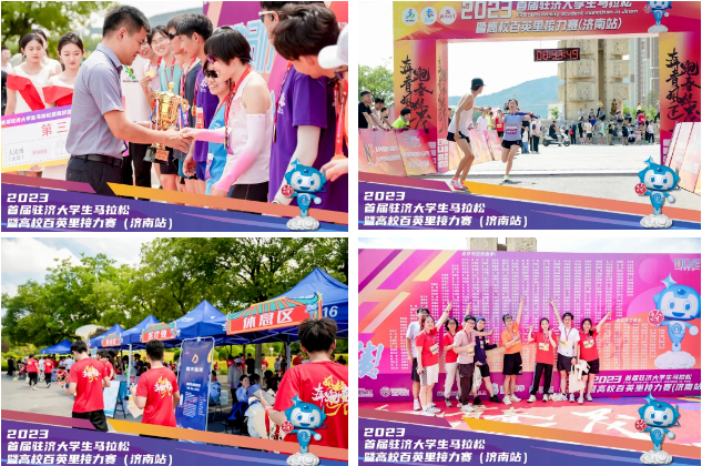 随着发令枪响,参赛选手们分成东西两队踏上人字形主题跑道,进行了“人字形主题热身跑”。大约500米后,选手们抵达天圆广场集结区,首届驻济大学生马拉松迷你项目和高校百英里接力赛全马接力项目激烈开赛。