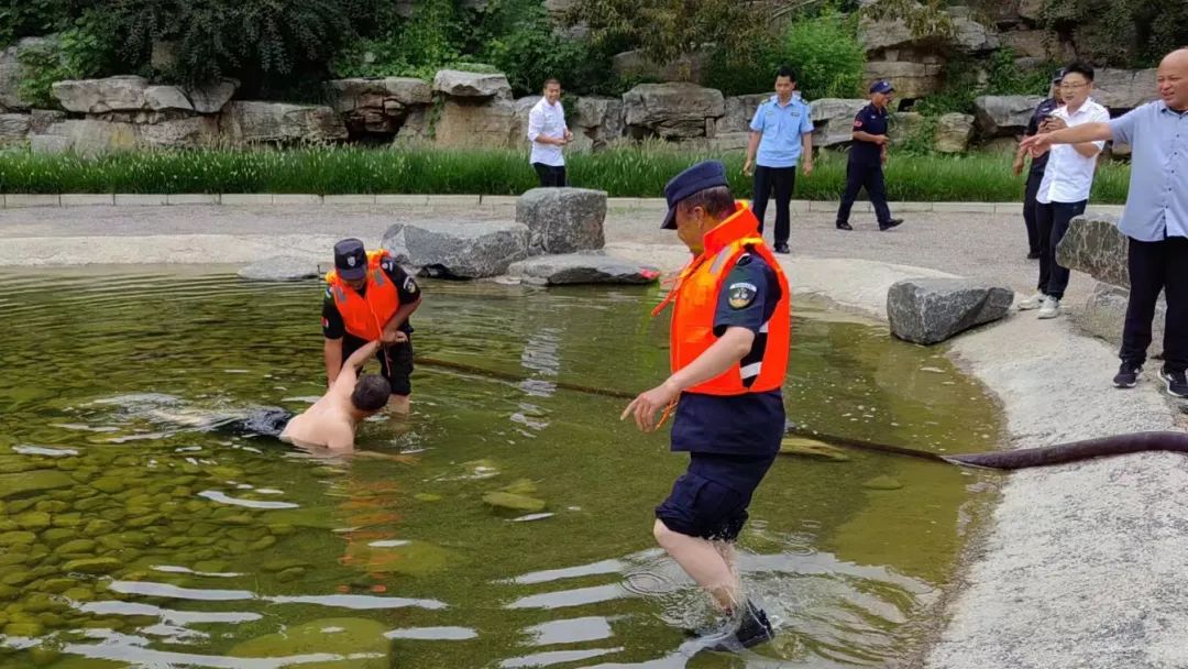 防溺水应急演练模拟北卧牛山公园因连续降雨造成月牙湾水位快速上涨,发生游客被困溺水事件,设置月牙湾入口处沙袋封堵洪水、道路封闭警戒、紧急排水、救助溺水游客等科目,演练了游客被困、防汛物资储备、紧急救助等各项险情的处置方案。