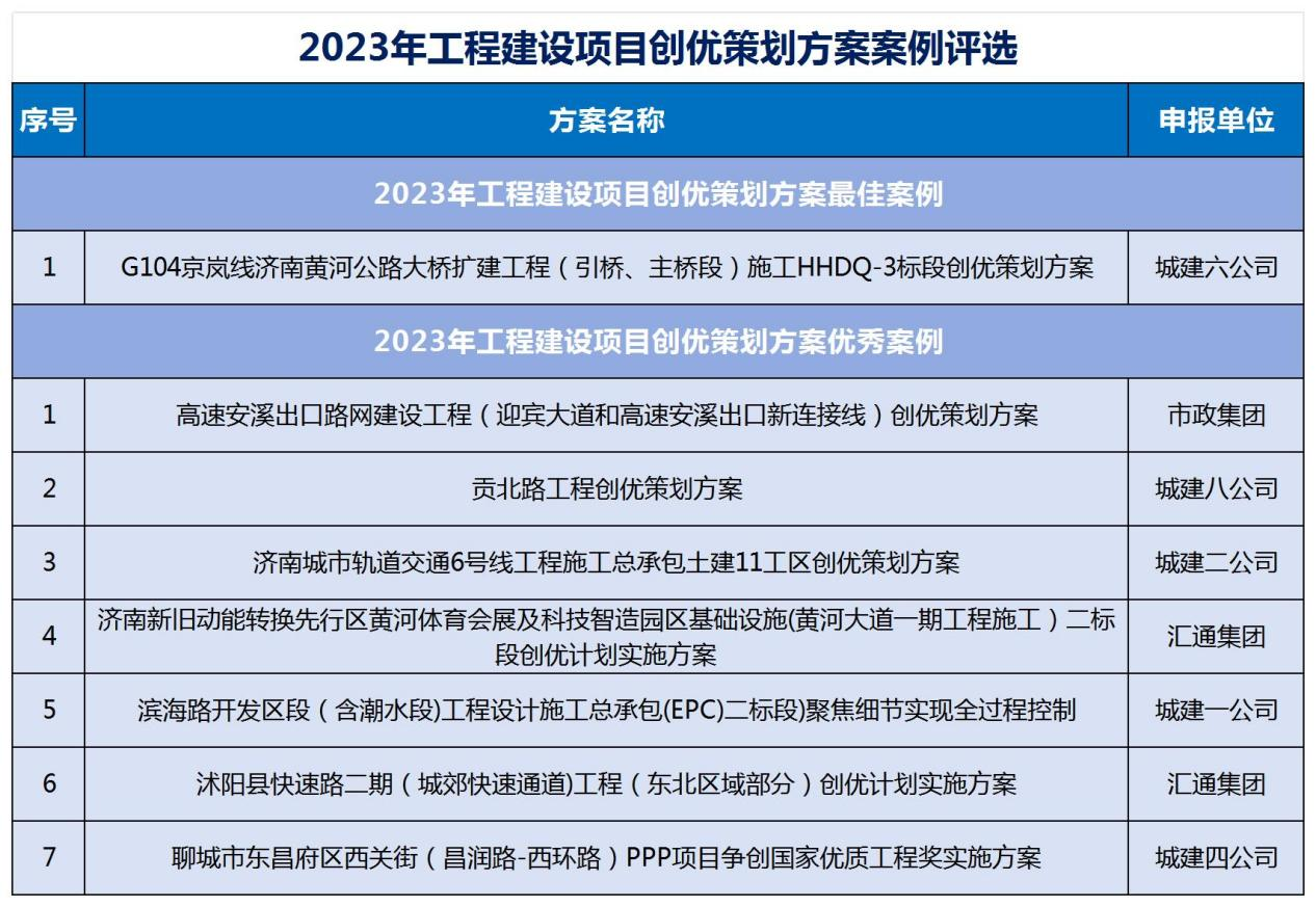 所属济南城建集团公司报送的《G104京岚线济南黄河公路大桥扩建工程(引桥、主桥段)施工HHDQ-3标段创优策划方案》在本次活动中获评最佳案例,《滨海路开发区段(含潮水段)工程设计施工总承包(EPC)二标段)聚焦细节实现全过程控制》等7项方案获评优秀案例。