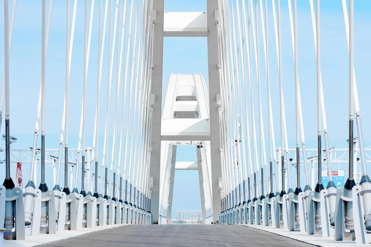 大桥桥塔整体造型源于“水滴”曲线线条,刚柔相济,轻盈通透,使桥梁与环境更有效的融合,也寓意着水文化对于济南这座城市的特殊意义,象牙白桥塔搭配水蓝色钢桁梁,则与泉水遥相呼应相得益彰。