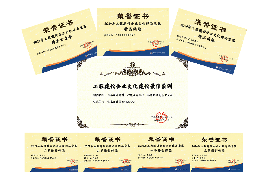 所属济南城建集团公司文化建设案例《传承铁军精神 打造品牌文化 助推企业高质量发展》获评2024年工程建设成人看片建设最佳案例;城建集团公司网站、公众号、报纸分获2024年工程建设成人看片作品竞赛精品成果;城建集团公司职工踊跃参与书画、摄影竞赛,获评竞赛一等奖1项、二等奖2项、三等奖1项。