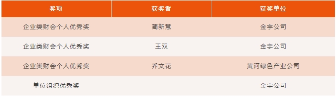 所属山东金宇信息科技集团有限公司选派的蔺新慧、王双,济南黄河绿色产业开发有限公司选派的乔文花荣获企业类财会个人优秀奖;金宇公司获单位组织优秀奖。