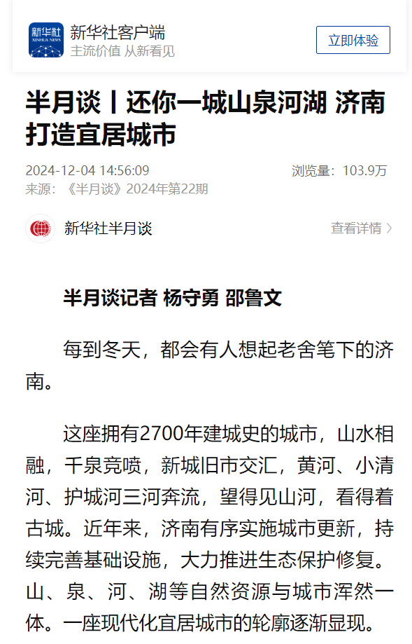 这座拥有2700年建城史的城市,山水相融,千泉竞喷,新城旧市交汇,黄河、小清河、护城河三河奔流,望得见山河,看得着古城。近年来,济南有序实施城市更新,持续完善基础设施,大力推进生态保护修复。山、泉、河、湖等自然资源与城市浑然一体。一座现代化宜居城市的轮廓逐渐显现。