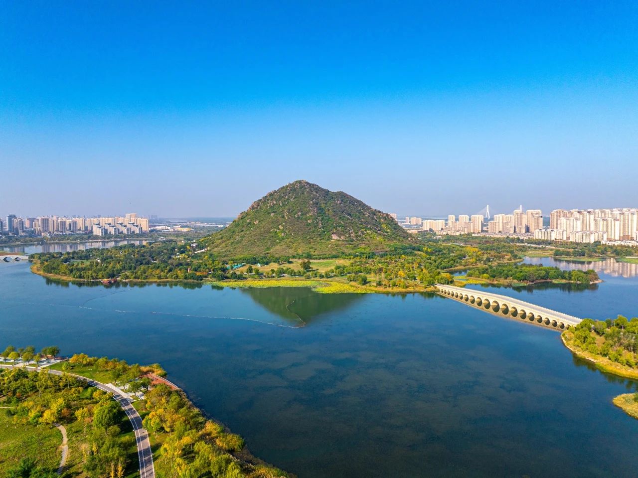 2013年以来,济南持续整治建设华山片区,面积达6平方公里之多的华山历史文化湿地公园建成纳客。海拔197米的华不注山下,华阳宫庄严肃穆,环山湖泊水波荡漾。一幅新时代的鹊华秋色画卷徐徐展开。
