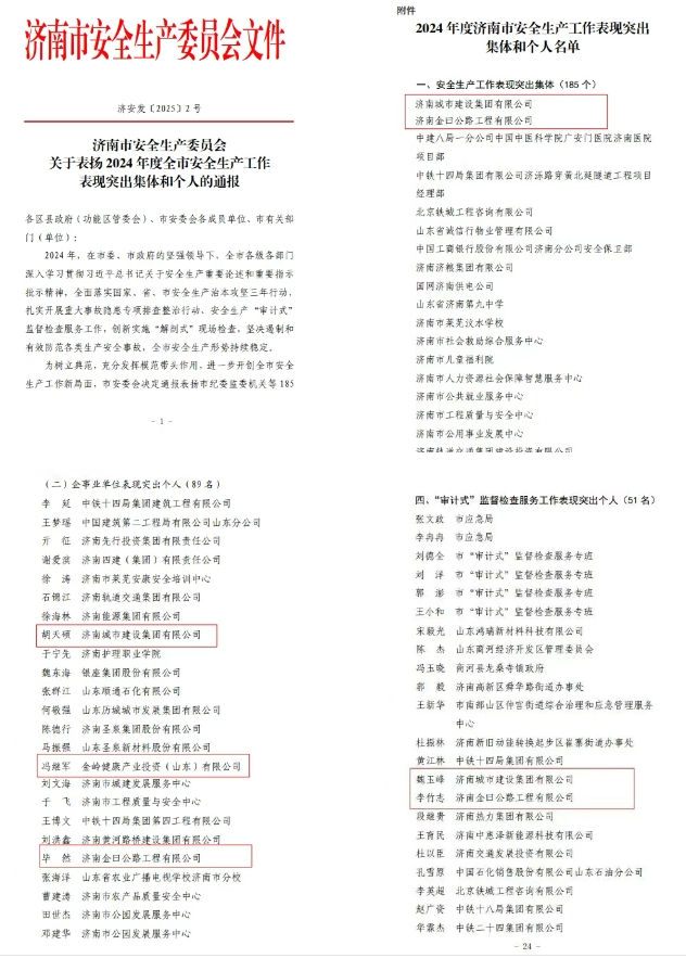 及集团所属山东金曰交通发展集团被评为安全生产工作表现突出集体,3名同志被评为安全生产工作表现突出个人,2名同志被评为“审计式”监督检查服务工作表现突出个人。