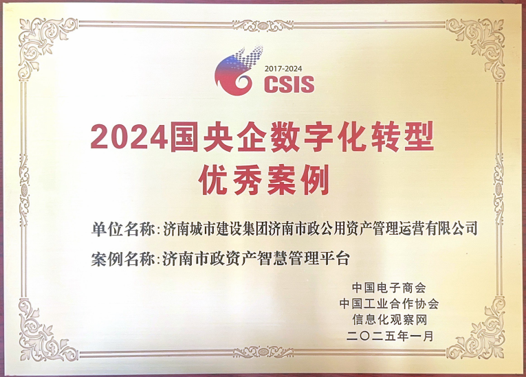 所属济南市政公用资产管理运营有限公司呈报的“济南市政资产智慧管理平台”荣获“2024国央企数字化转型优秀案例”。