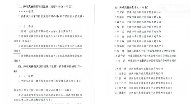 所属济南万融产业发展集团有限公司荣获项目建设(运营)单位二等奖、公司职工金宗云获评先进个人,万融集团所属济南春晓置业有限公司西客站安置二区三地块项目部荣获项目建设(运营)及参建单位班组一等奖。