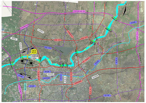 一标段南起现状济齐路,向北与虹吸干渠南路、虹吸干渠北路、吴家堡路、治黄路、规划路相交,采用高架形式跨越太平河南支路、太平河北支路、美里路、太平河北路、济广高速后,在美里湖路前落地,高架桥两侧设置一对辅道实现各交通流向的转换,终点接黄河大桥引桥,平面线位与规划线位一致,道路全长3671.89米。